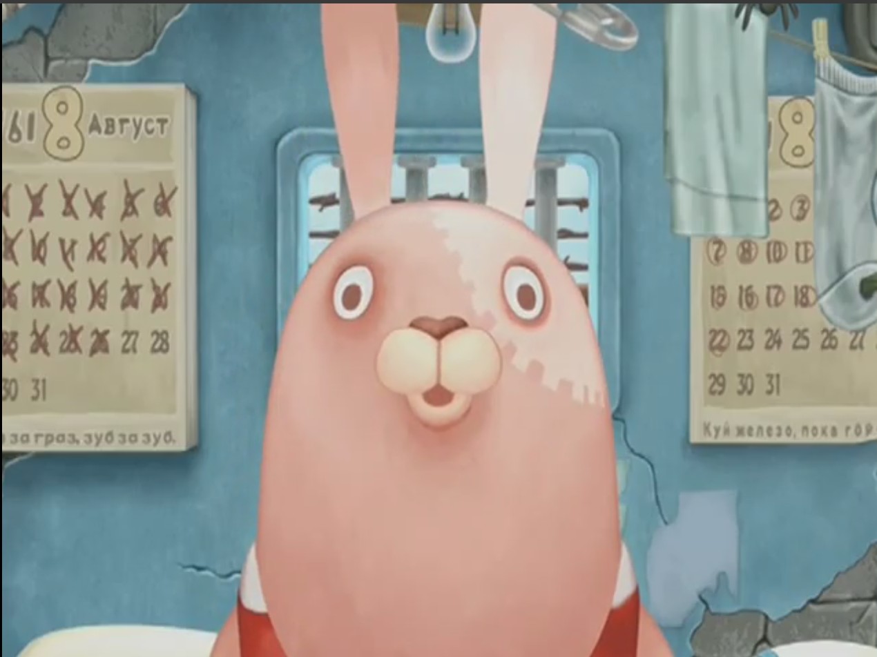 赤と白の横ストライプ模様の囚人服を着たウサギ。左の耳に安全ピ