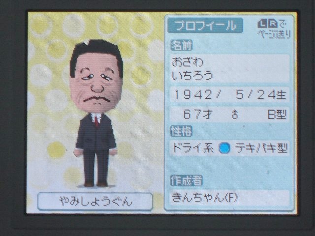 【政治家 小沢 一郎】をトモダチコレクションのMiiで作ろう